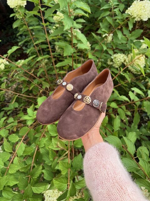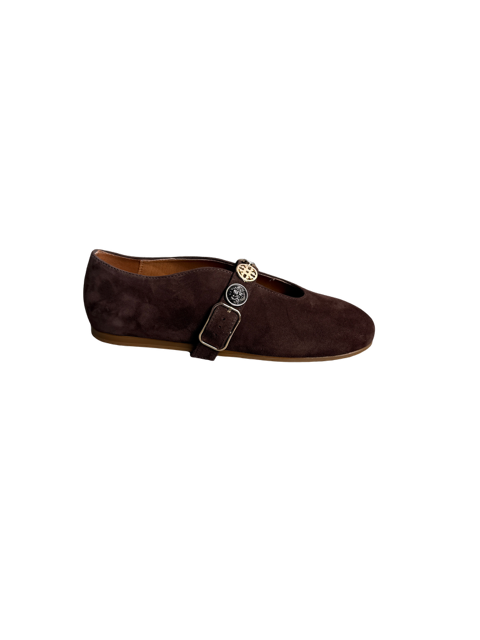 Zamszowe balerinki z ozdobnym, regulowanym paseczkiem na miękkiej podeszwie.