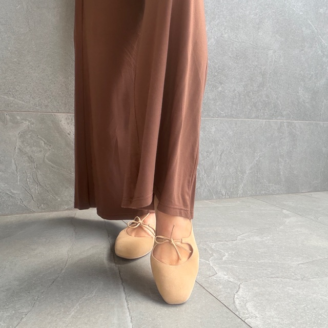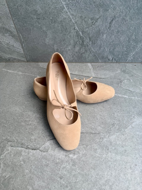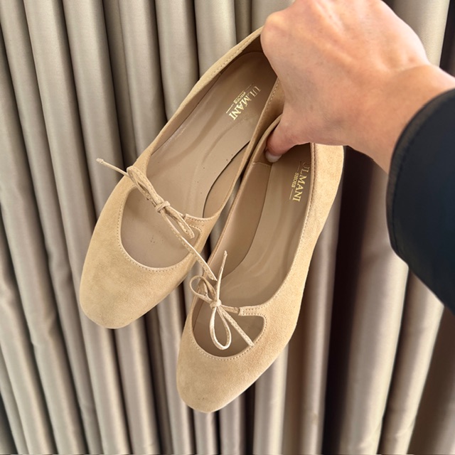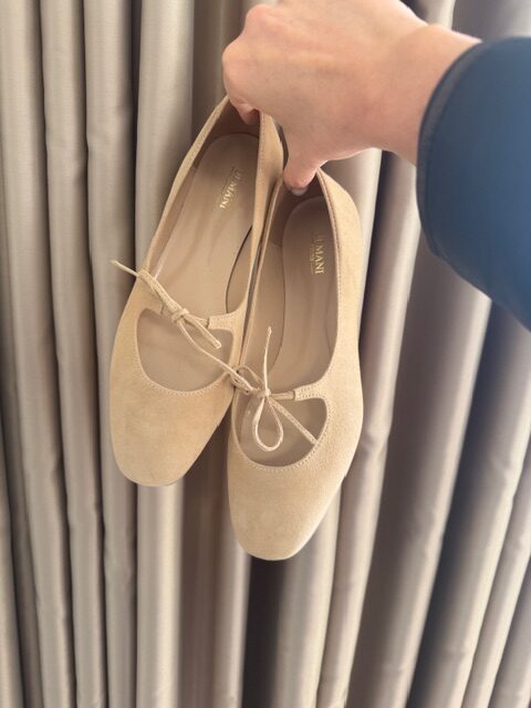 Delikatne minimalistyczne baleriny w ciepłym odcieniu nude z subtelną kokardką.