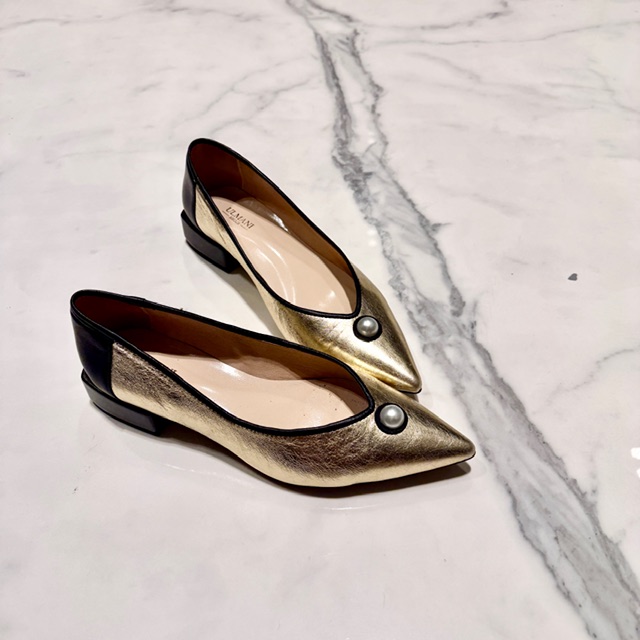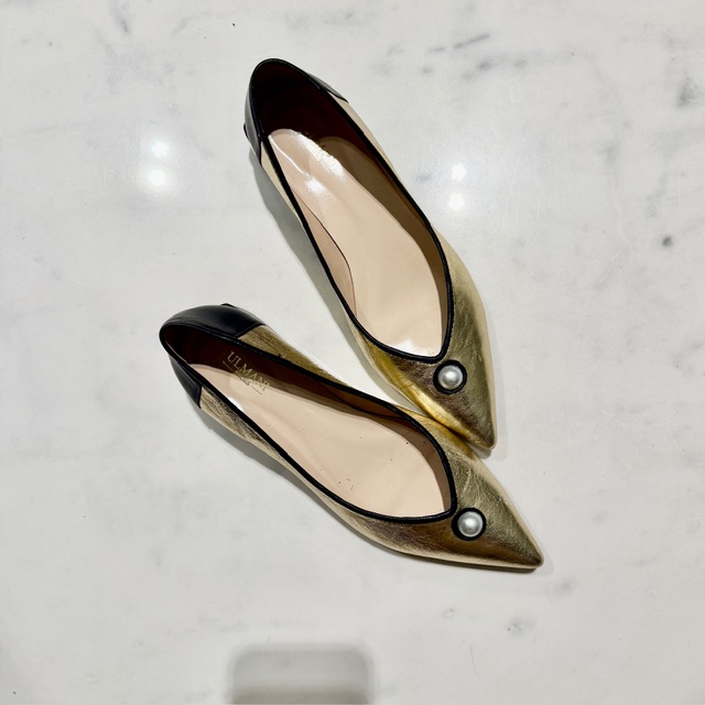 Bardzo wygodne złote belerinki na niskim stabilnym obcasie z biżuteryjnym detalem.