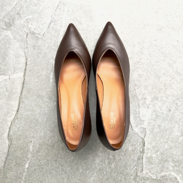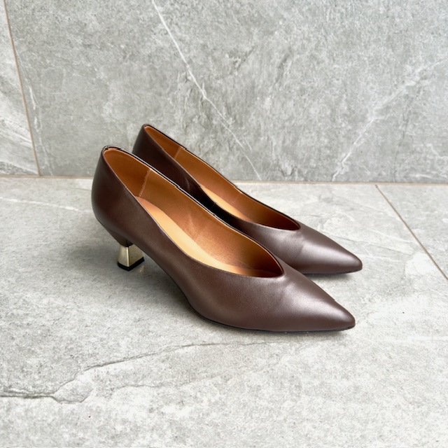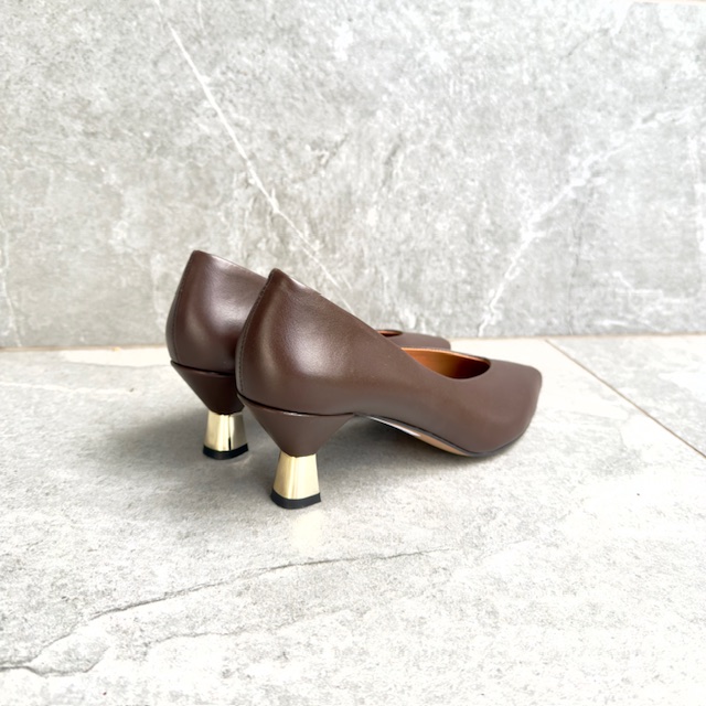 Eleganckie czółenka wykonane z wysokogatunkowej, miękkiej skóry naturalnej. Model zachwyca subtelną linią oraz stabilnym geometrycznym 5 cm obcasem o metalicznym wykończeniu w kolorze złota.
