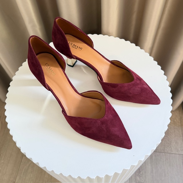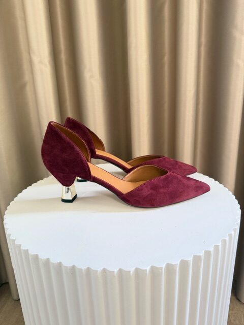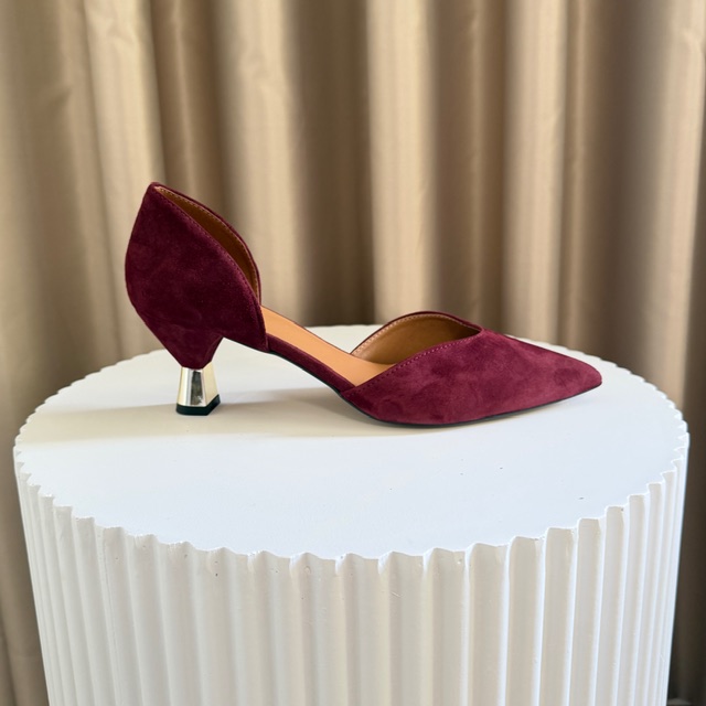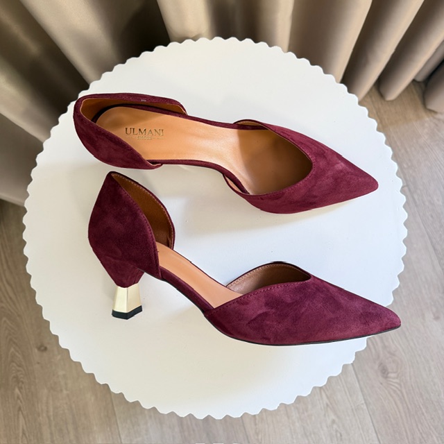 Eleganckie czółenka wykonane z wysokogatunkowego naturalnego zamszu. Model zachwyca subtelną linią oraz stabilnym geometrycznym 5 cm obcasem o metalicznym wykończeniu w kolorze złota.