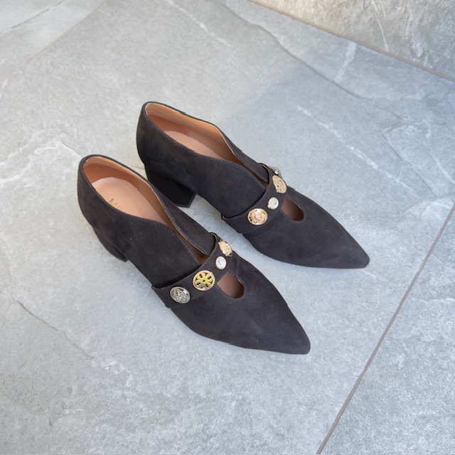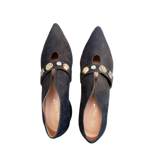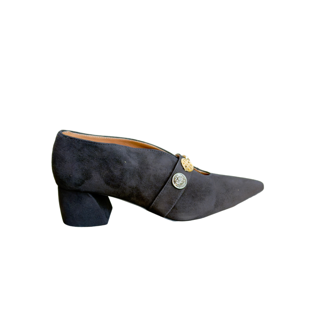 Elelganckie czółenka na stabilnym geometrycznym obcasie to propozycja dla kobiet ceniących ponadczasowy szyk z nutą oryginalności. Smukły szpiczasty nosek wysmukla sylwetkę, a ozdobny pasek z metalicznymi guzikami w złotym i srebrnym odcieniu dodaje im wyjątkowego, biżuteryjnego charakteru.