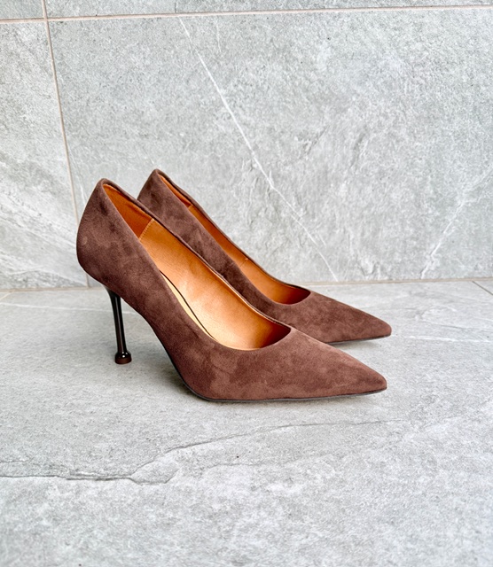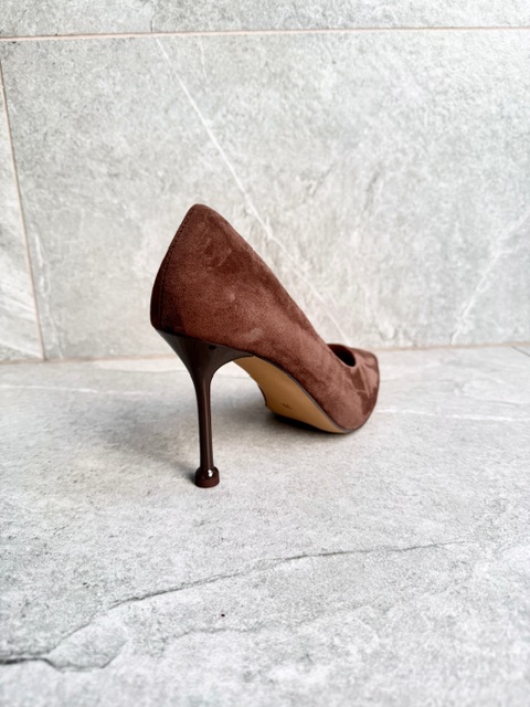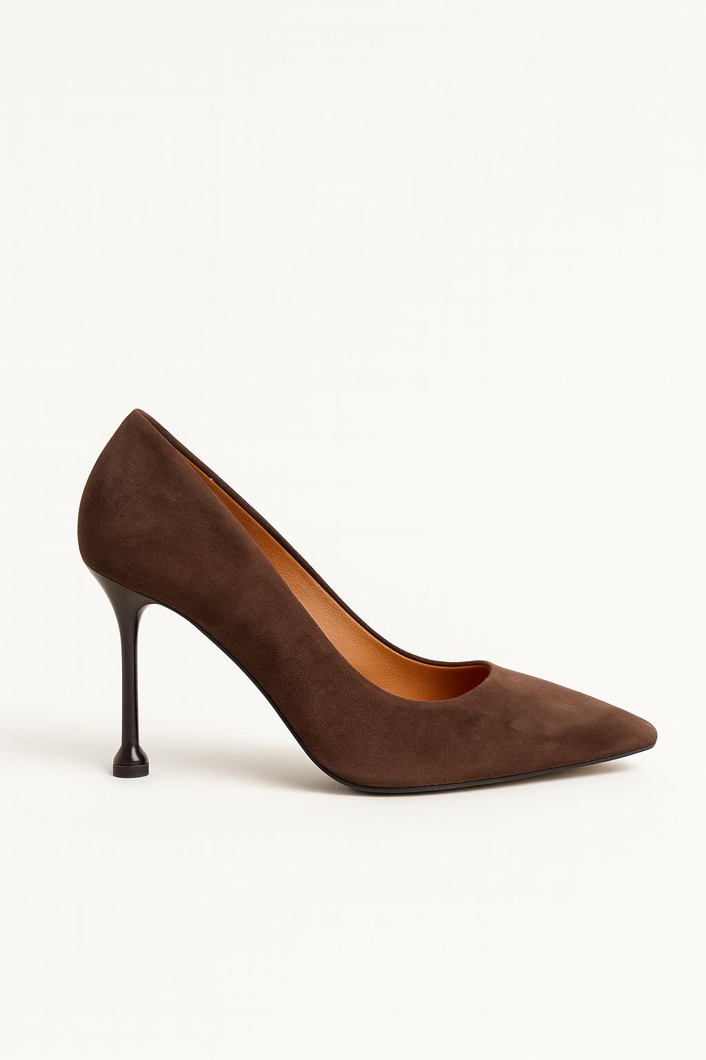 Minimalistyczne i zjawiskowe szpilki stworzone dla kobiet, które kochają klasykę w najbardziej luksusowym wydaniu. Wykonane z miękkiego brązowego zamszu pięknie otulają stopę i podkreślają jej linię.