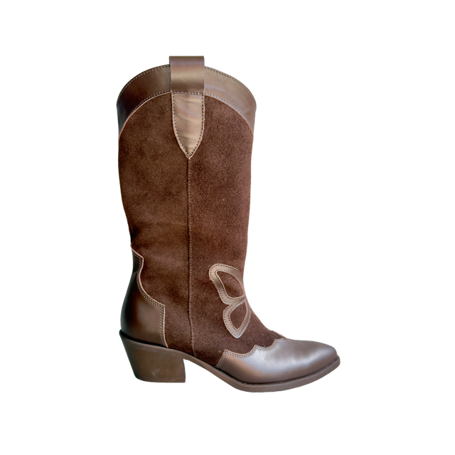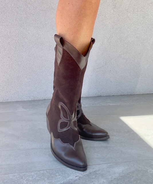 Czekoladowe kowbojki wykonane z połączenia miękkiego weluru i gładkiej skóry naturalnej.