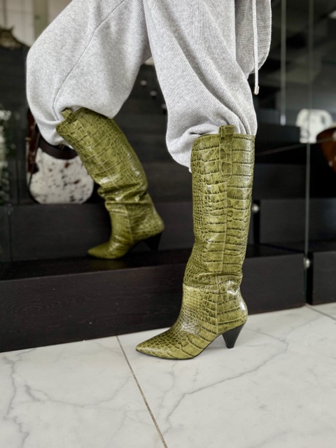Kozaki Croc Green to połączenie klasy i nowoczesnego minimalizmu. Wykonane z najwyższej jakości skóry o strukturze krokodyla zachwycają subtelnym połyskiem i perfekcyjnym krojem. Stabilny 5 cm obcas zapewnia komfort przez cały dzień.