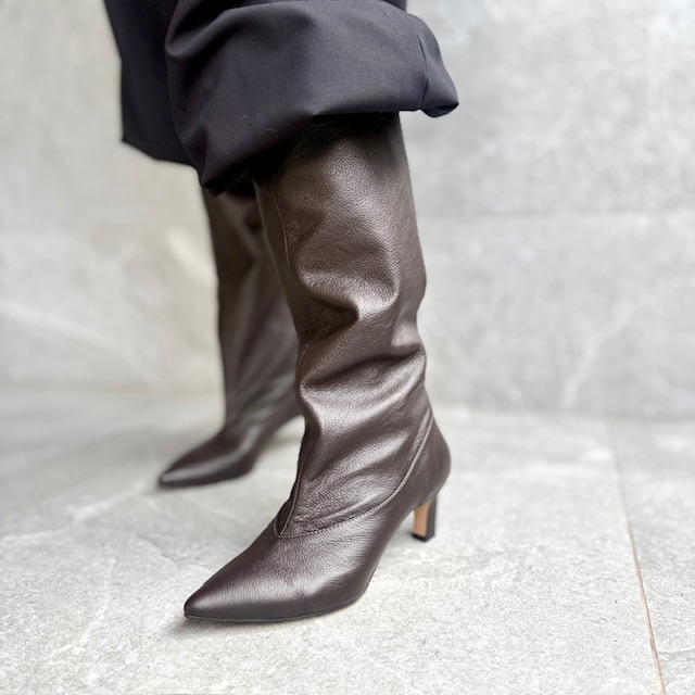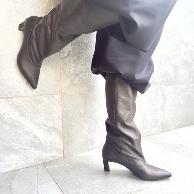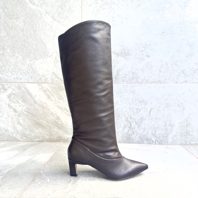 Kozaki Luna Brown to połączenie klasy i nowoczesnego minimalizmu. Wykonane z najwyższej jakości miękkiej skóry o strukturze groszku zachwycają subtelnym połyskiem i perfekcyjnym krojem. Stabilny 5 cm obcas zapewnia komfort przez cały dzień.